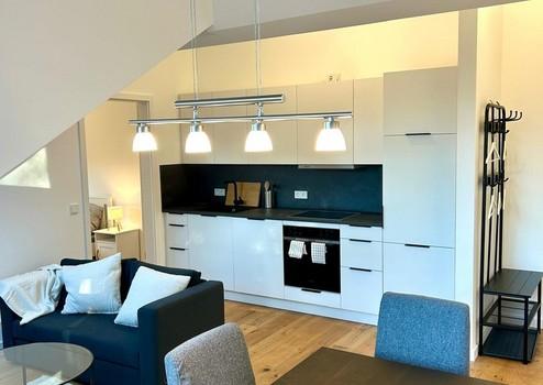 Das großzügige Wohnzimmer (ca. 23,5 m²) mit integrierter Küche bildet das Herzstück der Wohnung. Wie in allen Wohnräumen ist es mit modernem Echtholzparkett (Eiche) als Fußbodenbelag ausgestattet. Bereits hier erkennt man den besonderen Charme der Dachgeschosswohnung: Die gemütlichen Dachschrägen sind modern und dem natürlichen Aufbau des Daches sowie den tragenden Elementen nachempfunden. Im Wohnzimmer finden Esstisch, Couch und Fernseher – selbstverständlich mit Kabel- und Internetanschluss – sowie die vollständig mit hochwertigen Elektrogeräten ausgestattete Einbauküche ihren Platz.