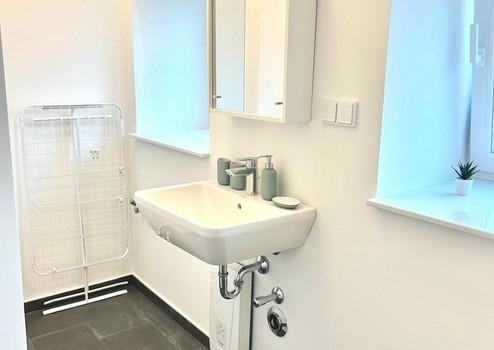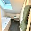 Vom Wohnzimmer aus gelangt man durch eine Tür in das ansprechende Badezimmer (ca. 5,7 m²) mit Badewanne, WC, Waschbecken und Spiegelschrank. Im Badezimmer sorgen neben dem Dachfenster auch zwei normale Fenster für eine helle und freundliche Atmosphäre.