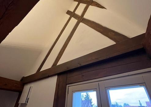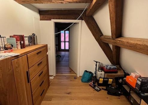 Dieses außergewöhnliche Dachgeschoss-Loft vereint historischen Charme mit großzügigem Raumgefühl. Die sichtbar erhaltenen Fachwerkbalken verleihen der Wohnung eine warme, authentische Atmosphäre und unterstreichen den einzigartigen Charakter des Objekts. Die beeindruckende Deckenhöhe schafft ein offenes, luftiges Wohngefühl und lässt viel Raum für individuelle Gestaltungsmöglichkeiten.