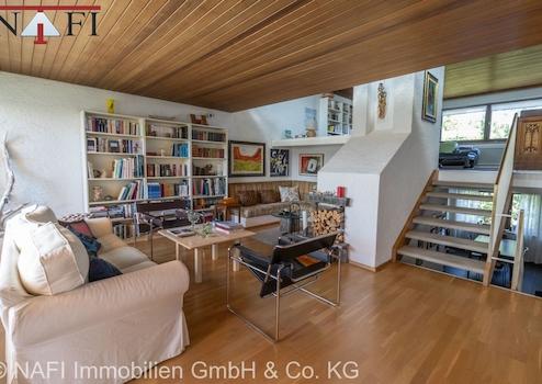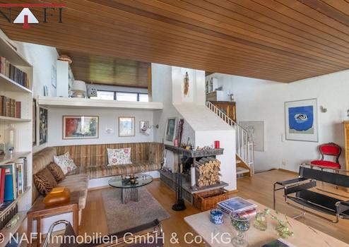 - Wohnzimmer auf zwei Ebenen mit bodentiefen Fenstern und direktem Zugang zur Dachterrasse