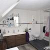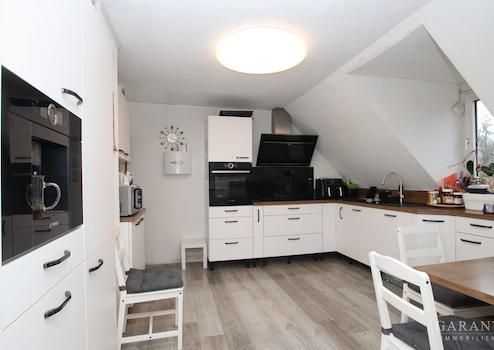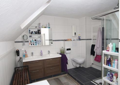 Das Obergeschoss mit rund 77 qm teilt sich auf in 3,5 Zimmer, Küche und Bad. Der ausgebaute Spitzboden ist von dieser Wohnung, über eine relativ steile Treppe, erreichbar und zusätzlich nutzbar.