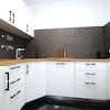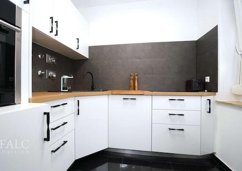 Die Küche präsentiert sich in einem zeitlosen Weiß und ist mit einer pflegeleichten Holzarbeitsplatte ausgestattet. Großzügig verlegte Fliesen entlang der Küchenzeile sorgen für einen effektiven Spritzschutz der Wand und unterstreichen zugleich das gepflegte Erscheinungsbild. Die Küche bietet alle notwendigen Ausstattungsmerkmale, die das Kochherz begehrt, und fügt sich sowohl funktional als auch optisch harmonisch in den Wohnbereich ein.