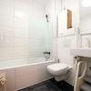 Das Badezimmer ist klassisch weiß gefliest und verfügt über ein WC, eine Badewanne mit Glasschutz sowie einen komfortablen Waschbeckenbereich mit Badeschrank, der praktischen Stauraum bietet. Ideal für eine angenehme Morgen- und Abendroutine.