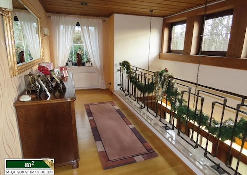 Das freistehende EFH mit EL-Wohnung besticht durch seine architektonische Bauweise. Es wurde im Jahre 1980 in solider Bauweise errichtet. Durch den anmutigen Treppenturm sind die beiden Hauseingänge voneinander getrennt. Der Eingangsbereich ist mit Treppenstufen in Travertin angelegt. Die Türanlage besteht aus massivem Eichenholz mit Butzenverglasung. Der links gelegene Eingangsbereich des Hauptteils ist durch Einbaumöbel und Garderobeneinbauten in rustikalem Charakter geprägt. Zur rechten Seite befindet sich die Gäste-Toilette.