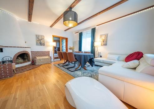Besondere Merkmale wie ein offener Kamin im Wohnzimmer, ein Kachelofen im Obergeschoss sowie eine finnische Sauna unterstreichen den individuellen Charakter des Hauses. Moderne Infrastruktur ist vorhanden, einschließlich Glasfaseranschluss mit bis zu 1.000 Mbit/s.