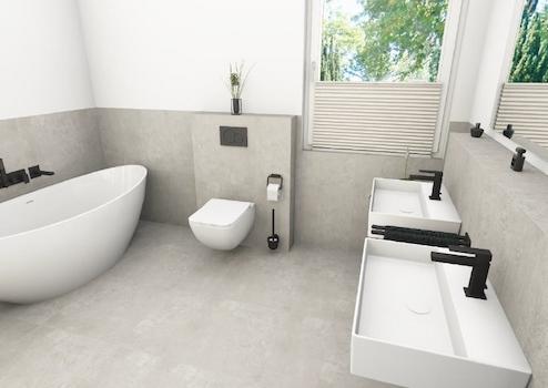 Großzügige Fliesenflächen, hochwertige weiße Keramik deutscher Marken wie Villeroy & Boch oder Geberit sowie moderne schwarze Gessi-Armaturen prägen das elegante Gesamtbild. Barrierefreie Duschen mit Bodenablaufrinne sowie eine mechanische Zwangsentlüftung in innenliegenden Räumen sorgen für zusätzlichen Komfort.