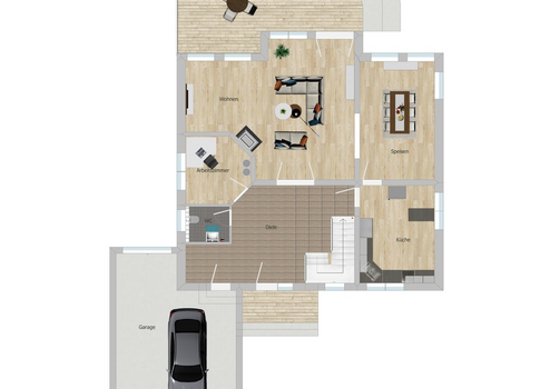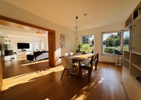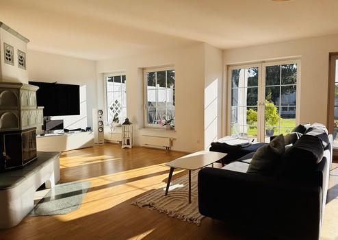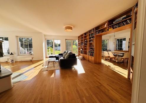 Über den repräsentativen Eingangsbereich mit großzügiger Diele und maßgefertigten Einbauschränken gelangen Sie in den lichtdurchfluteten Wohnbereich, der sich fließend in Ess- und Relaxzone gliedert. Ein stilvoller Kaminofen und edler Parkettboden mit Fußbodenheizung sorgen hier für ein behagliches Wohngefühl.
