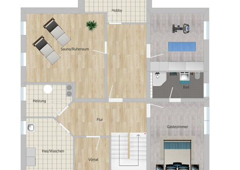 individuell nutzbare Zimmer, die vielfältige Wohn- oder Arbeitsmöglichkeiten eröffnen. Ein Gästezimmer ist hier zusätzlich mit einem hochwertigen „Bad en suite“ ausgestattet. Ergänzt wird dieser Bereich durch den Hauswirtschafts- und Heizungsraum sowie einen Vorratsraum. Dank der durchdachten Aufteilung ist hier sogar die Einrichtung einer separaten Einliegerwohnung denkbar. Momentan werden die Räume für Gäste und als Fitness-, Sport und Saunaraum genutzt.