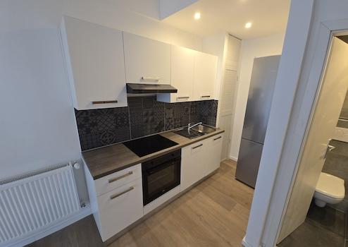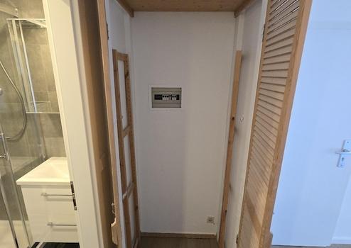 Die Wohnung verfügt über einen *offenen Wohn- und Essbereich mit integrierter Einbauküche, ein **Schlafzimmer, ein **Badezimmer sowie eine kleine Abstellkammer.