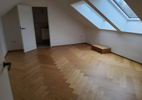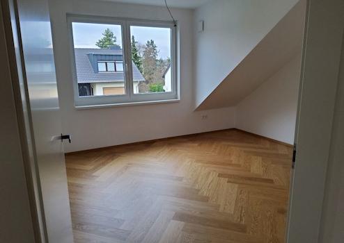 Ein großzügiges Dreifamilienhaus in einer gewachsenen Lage wurde mit höchstem Komfort und höchstem Effizienzhaus-Standard ausgestattet, Sie ziehen als Erste ein. Von der zentralen Diele gelangen Sie in alle Räume. Zwei große Räume mit großen Fenstern können als Schlaf- oder Arbeitsräume genutzt werden. Das Bad ist mit hochwertigen Sanitäranlagen und einer bodengleich gefliesten Dusche ausgestattet. Der großzügige, lichtdurchflutete Wohnbereich ist offen mit der Küche und dem Essbereich verbunden. Eine Küchenplanung mit allen Anschlüssen für eine vollausgestattete Küchenzeile ist vorhanden. Die hochwertigen Parkettböden und die bodentiefen Fenster sorgen für ein modernes und helles Ambiente. Von der weitläufigen Loggia blicken Sie in die Gärten und zum nahen Wald. Über eine Treppe mit Holzstufen gelangen Sie zum ausgebauten Dachstudio. Dort können Sie ein weiteres großes Zimmer nach Ihren Bedürfnissen - privat oder beruflich - nutzen. Ein kleines WC ist dort ebenfalls vorhanden.