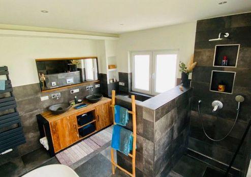 Im OG befinden sich die gemütlichen Schlafzimmer und das Badezimmer, das mit einer stilvollen Ausstattung und einer großzügigen Dusche und hochwertiger ovaler Badewanne ausgestattet ist.
