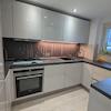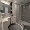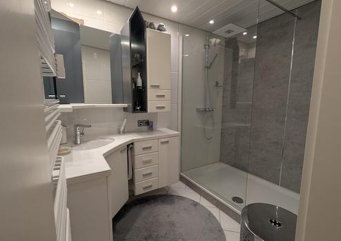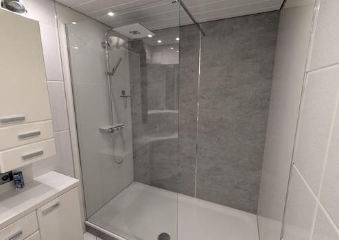 Die Wohnung ist mit einer hochwertigen modernen Einbauküche ausgestattet und verfügt über ein Badezimmer mit Walk-In-Dusche sowie Regenduschkopf.