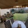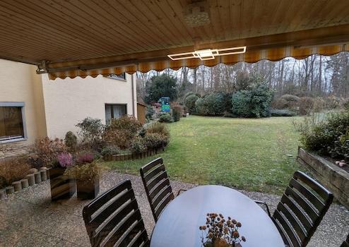 Der an die Terrasse grenzende Garten reicht bis an den Waldrand.