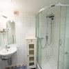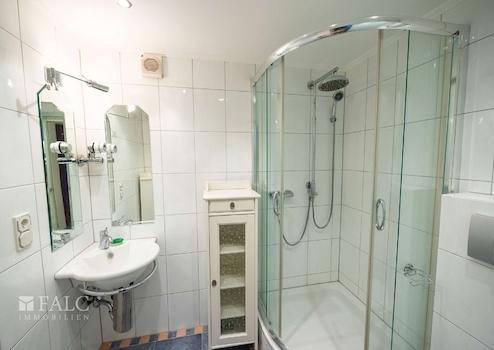 Das Badezimmer präsentiert sich hell und zeitlos: freundliche Fliesen, weiße Sanitärelemente und eine moderne Duschkabine schaffen einen Ort, an dem der Tag entspannt beginnt und ebenso ruhig endet. Der helle Fliesenboden zieht sich durch die gesamte Wohnung und sorgt für ein ruhiges, einheitliches Gesamtbild.
