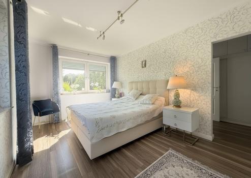Komplettiert wird diese Etage durch eine neuwertige Premium-Einbauküche (Markengeräte & viel Stauraum) sowie einen separaten Schlaftrakt mit drei Zimmern und zwei Bädern – ideal für barrierefreies Familienwohnen auf einer Ebene.