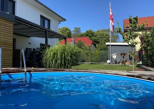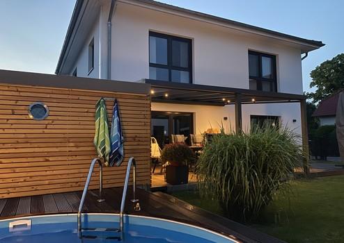 Terrasse, Garten, Vollbad, Duschbad, Pool · Schwimmbad, Einbauküche, Gäste-WC, Kamin, Laminat, Fliesen