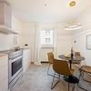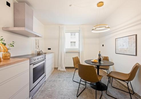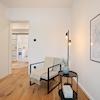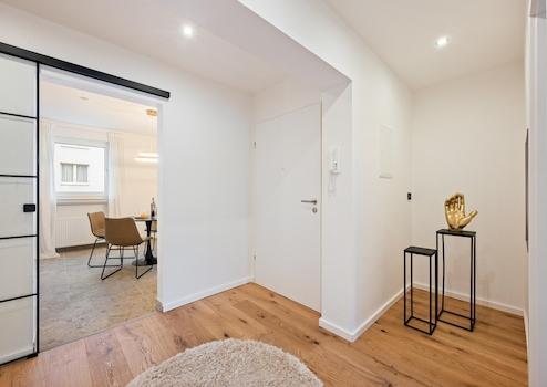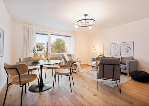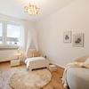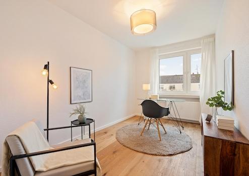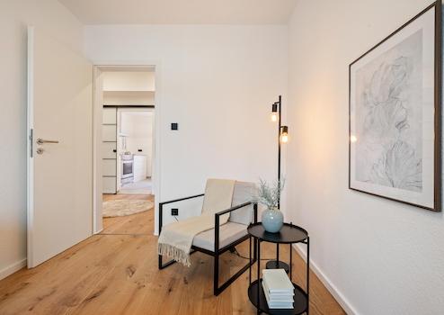 Neben dem Wohnzimmer verfügt die Wohnung über ein geräumiges Schlafzimmer sowie zwei weitere Zimmer, die flexibel als Kinder-, Gäste- oder Arbeitszimmer genutzt werden können. Die Küche ist großzügig geschnitten und über ein modernes Schiebetürelement angebunden. Das neu gestaltete Tageslicht-Badezimmer wurde im Rahmen der vollständigen Sanierung hochwertig ausgestattet und verfügt über Marken-Sanitärprodukte sowie eine Duschwanne mit niedriger Einstiegshöhe, die Komfort und Alltagstauglichkeit vereint.
