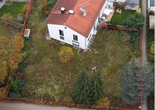 Die Fläche des Grundstücks beträgt 629 m2 und ist derzeit bebaut mit einer DHH (1957) mit ca. 97 m2 Wohnfläche im EG/OG, die zur Kernsanierung oder alternativ zum Abriss vorbereitet ist. Baukörper, Dach und Fenster sind in guter Qualität, der komplette Innenausbau ist erforderlich. Eine Erweiterung mit Aufstockung des Dachgeschosses, Ausbau des Kellers zum Wohnraum und/oder Ergänzung eines Anbaus oder Wintergarten zur erheblichen Vergrößerung der Wohnfläche sind auf dem großzügigen Grundstück jetzt oder später prinzipiell möglich. Eine Baugenehmigung für 250m2 Wohnfläche zzgl. 112 m2 Nutz- oder Zubehörfläche, liegt bereits vor.