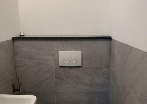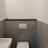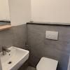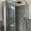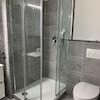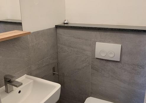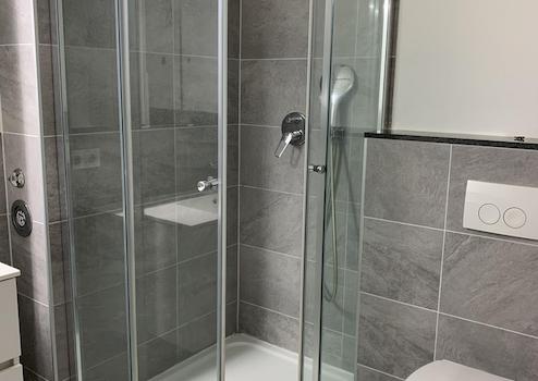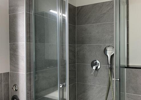 Das Badezimmer erstrahlt in neuem Glanz mit einer modernen Glasduschkabine, einem stilvollen, möblierten Waschbecken sowie einem wandhängenden WC mit hochwertigen Armaturen. Ein elektrischer Abluftventilator sorgt in beiden Badezimmern für eine gute Luftzirkulation.