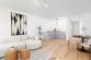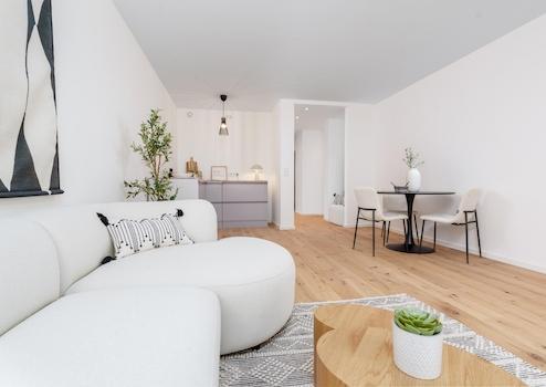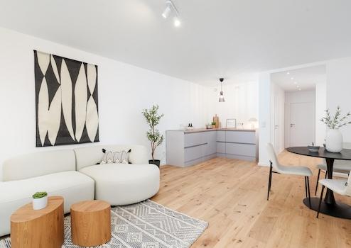 Der offen gestaltete Wohn-, Ess- und Küchenbereich bildet den zentralen Raum der Wohnung. Große Fenster sorgen für viel Licht, der Echtholzparkettboden schafft eine warme und einladende Wirkung. Der Südbalkon ist direkt angeschlossen und bietet ausreichend Platz für entspannte Stunden im Freien.