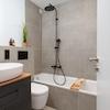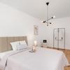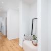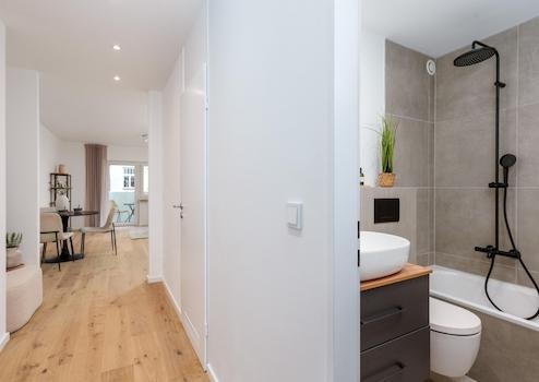 Das modern ausgestattete Badezimmer überzeugt mit hochwertigen Morassi-Feinsteinzeugfliesen, einer Badewanne, Fußbodenheizung sowie einem stilvollen Waschtisch. Zwei gut geschnittene Zimmer lassen sich flexibel als Schlaf-, Kinder- oder Arbeitszimmer nutzen. Der großzügige Flur bietet Platz für eine Garderobe und sorgt für einen aufgeräumten Eindruck.