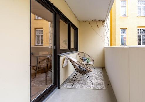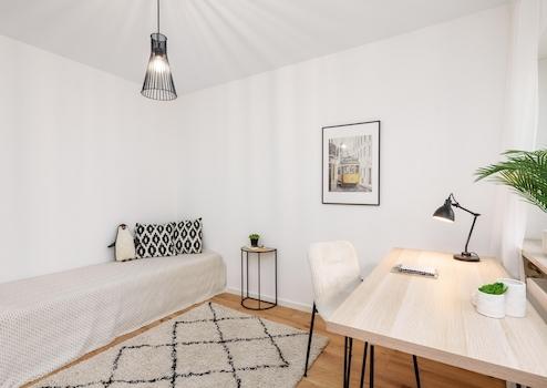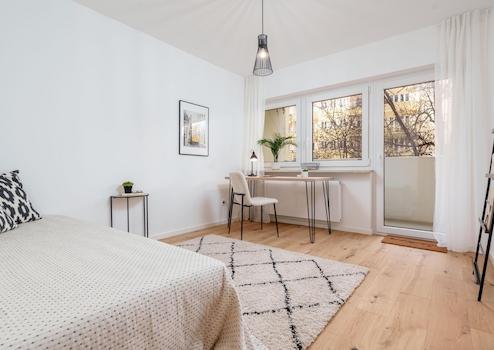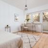 Das Schlafzimmer verfügt über einen eigenen Zugang zum zweiten Balkon. Dieser ist nach Norden ausgerichtet, ruhig gelegen und blickt in den Innenhof – ein angenehmer Rückzugsort.