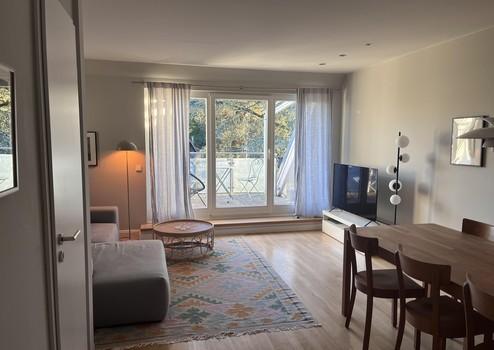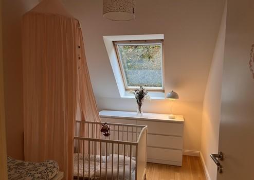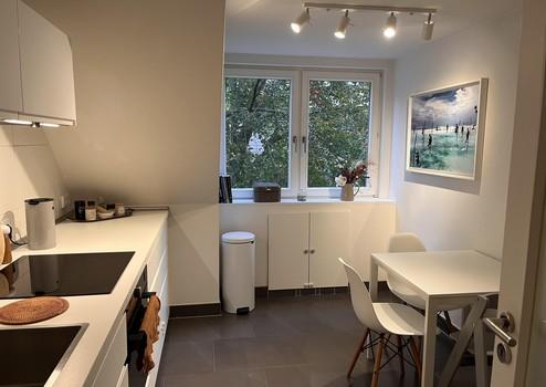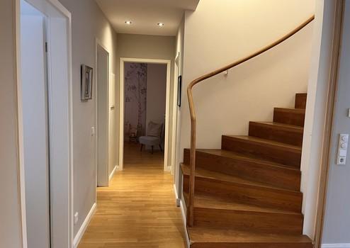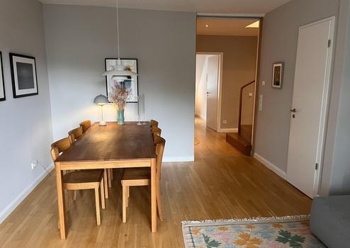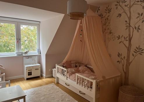 Die ca. 112 m² große Maisonette-Wohnung befindet sich in Hamburg-Lokstedt nahe dem UKE in einer ruhigen Straße, die von Rotbuchen gesäumt ist. Die Wohnung ist hell, gemütlich und sehr gepflegt – ein Ort zum Wohlfühlen und Ankommen. Vom Eingangsbereich mit praktischen Einbauschränken erreichen Sie über den Flur das rund 24 m² Wohn- und Esszimmer mit bodentiefen Fenstern, die für viel Licht sorgen. Hier schließt sich der nach Süden ausgerichtete Balkon mit einer elektrischen Markise an. Gegenüber befindet sich ein Kinderzimmer, das sich auch als Arbeitszimmer eignen würde. Daneben liegt die Küche, die mit hochwertigen Bodenfliesen ausgestattet ist und über eine moderne Einbauküche verfügt. Das gegenüberliegende Duschbad ist geräumig und bietet durch einen Einbauschrank Platz für eine Waschmaschine. Neben dem Bad befindet sich ein weiteres, gemütliches Kinderzimmer. Die Holztreppe führt in ein ca. 26 m² großes Zimmer mit sehr hohen Decken und Velux-Fenstern, das momentan als Schlafzimmer genutzt wird. Hier schließen sich ein Ankleidezimmer, ein weiteres Bad und ein Abstellraum an. Die gesamte Wohnung verfügt über Fußbodenheizung. Im Kellergeschoss gibt es eine Waschküche mit Platz für Waschmaschine und Trockner. Die großzügige Tiefgarage beinhaltet einen Tiefgaragenstellplatz für jede Wohneinheit und bietet Abstellmöglichkeiten für z. B. Kinderwagen oder Lastenräder.