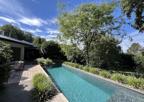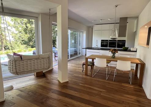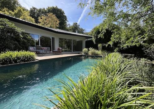 Dieses Anwesen ist mehr als ein Haus – es ist ein bewusst gestalteter Lebensraum, in dem Architektur, Natur und Stille ein harmonisches Ganzes bilden. Bodentiefe Fenster öffnen den Blick in den Garten, auf das glitzernde Wasser des Naturpools und die umgebende Vegetation. Ein Atemzug - und der Alltag fällt ab.