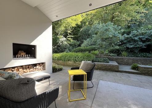 Natürliche Materialien wie geöltes Eichenparkett, Lehmputzwände mit Wandheizung und sorgfältig gesetzte Lichtachsen erzeugen Wärme, Klarheit und eine Gefühl von Behutsamkeit. Der offene Wohnbereich mit Kamin verbindet Geborgenheit und Weite, die Übergänge zwischen Innen und Außen fließen sanft – Licht, Luft und Grün werden Teil des Wohngefühls.
