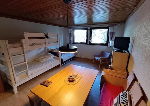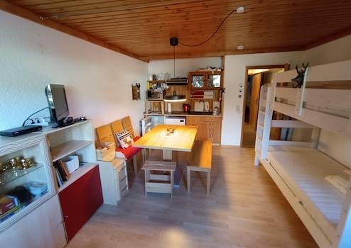 Diese auch als Ferienwohnung genutzte 1-Zimmer-Wohnnung mit voll ausgestatteter Küchenzeile inkl. kleiner Spülmaschine und Elektrobackofen-Mikrowellenkombination, Etagenbett, Sofa als Schlafsofa ausziehbar, großen Esstisch und kleiner Leseecke eignet sich gut für Personen, die vorübergehend eine günstige aber trotzdem ruhig und schön gelegene Unterkunft im Schwarzwald suchen.