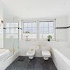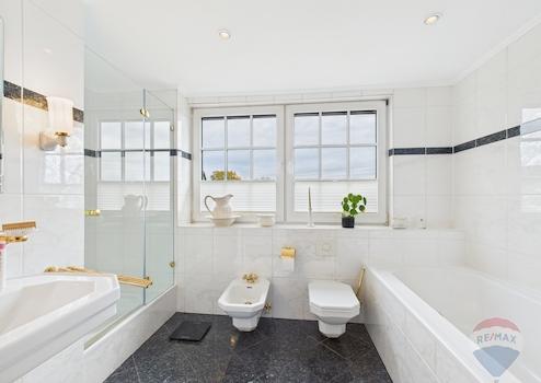 Das Tageslichtbad im Stil der 1930er Jahre ist mit einer separaten Dusche, einer Badewanne und hochwertigen Armaturen ausgestattet. Ein weiteres Badezimmer befindet sich im voll ausgebauten Keller, der zusätzlich einen beheizbaren Raum mit eingebauter Bar bietet.