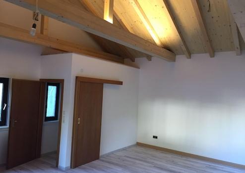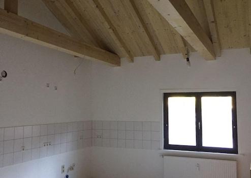 Hier wurde 2016 ein komplett neuer, gedämmter Dachstuhl errichtet, eine Heizungsleitung vom Haupthaus verlegt, sowie die Bodenaufbauten erneuert, gedämmt und abgedichtet, sowie eine diffusionsoffene Dämmung der Rückwand zum Hang ausgeführt.