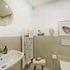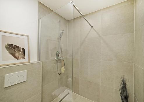 Das Bad mit begehbarer Dusche besticht durch seine klassische, moderne Farbgestaltung und Ausstattung.