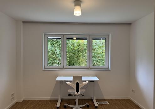 Durch bodentiefe Fenster hat das Wohnzimmer ein helles, sonniges Wohnambiente. Im gesamten Wohnbereich, Flur und Schlafzimmern sorgen das moderne Eichenparkett, die Fussbodenheizung und die weiß verputzten Wände für ein behagliches modernes Wohngefühl. Die sanitären Anlagen im Bad und Gäste WC bieten modernes Design, Markenprodukte (Alape, Keramag, Grohe, Hansa), maßgefertigte Spiegel sowie Komfort mit Badewanne und begehbarer Regendusche. Die zwei weiteren Zimmer lassen sich hervorragend als Schlafzimmer und Kinder-, Gäste- oder Home-Office bzw Arbeitszimmer nutzen. Neben dem separaten Kellerraum sind ein großzügiger PKW-Außenstellplatz und überdachter Fahrradstellplatz vorhanden.