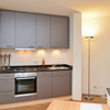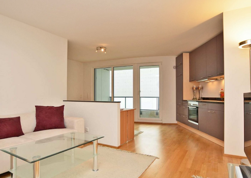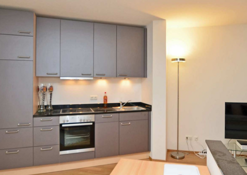 Die schöne Küche wurde geschickt in den Wohnbereich integriert. Eine versetz- oder erweiterbare Wand schirmt den Schlafbereich (0,5 Zimmer) weitgehend ab.