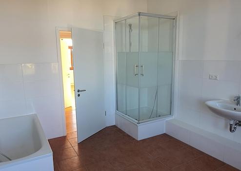 Die Fußböden der Wohnräume bestehen aus Echtholzdielen oder Laminat. Die Wände sind weiß gehalten, alles neu gestrichen. Das Bad (mit Badewanne, Dusche und Waschmaschinenplatz) ist aktuell komplett erneuert, mit modernen weißen Fliesen an den Wänden und terracottafarbenen Bodenfliesen.