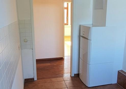 Die geflieste Küche beherbergt die moderne Gastherme, die die komplette Wohnung mit Wärme und warmen Wasser versorgt. Daneben das große Bad ebenfalls zentral zugänglich. Auf dem Lageplan erkennen sie konkret die Anordnung der Räume.