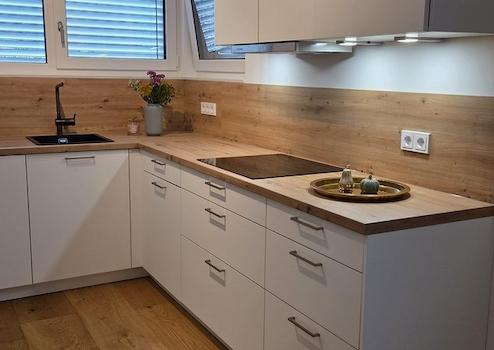 - Offene Wohnküche mit moderner Bistro-Essgruppe, hochwertiger Einbauküche (Cerankochfeld, Backofen, Mikrowelle, Geschirrspüler, komplettes Kücheninventar)