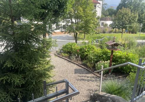 Zur Wohnung gehören eine sichtgeschützte Terrasse und ein liebevoll angelegter Blumengarten sowie zwei Tiefgaragenstellplätze und ein Kellerabteil.