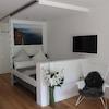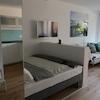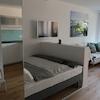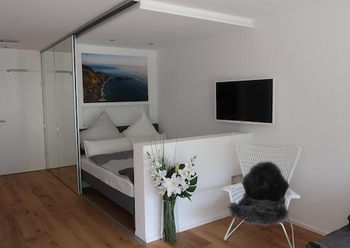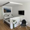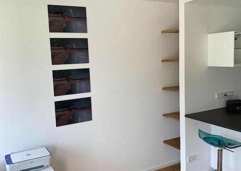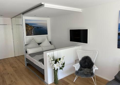 - LCD-Fernseher 40‘‘ (100cm), Wandinstallation 180° drehbar (einsehbar von Schlafen, Küche, Wohnen, Arbeiten) inkl. Glasfaseranschluss mit ca. 300 Sendern