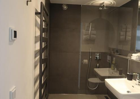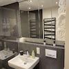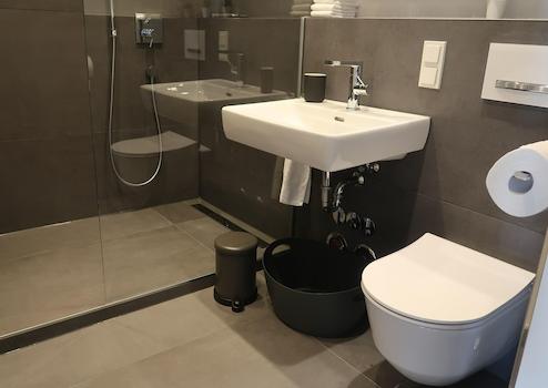 - stylisch, modernes Bad mit begehbarer Dusche, Fußbodenheizung, Rain-Shower und Handbrause, stylischer Wandheizkörper, 2x große, beleuchtete Spiegelschränke, Abluftsystem, Pocket-Glasschiebetür