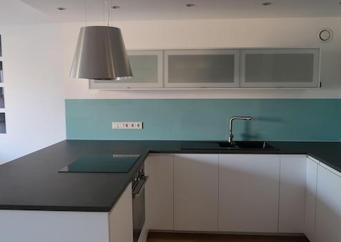 - moderne, neuwertige Einbauküche inklusive große Kühl- und Gefrierkombination, Ceranfeld, Backofen, Geschirrspülmaschine, Waschmaschine, beleuchtete Dunstabzugshaube (Kohlefilter), große Quarzkompositespüle, große Arbeitsbereiche, Mülltrennsystem, ausreichend Staumöglichkeiten, beleuchtete Hängeschränke, Abluftsystem, 3 moderne Acryl-Bar-Hocker