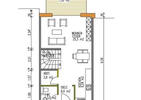 Die Planung für dieses Objekt sieht im Erdgeschoß einen geräumigen Wohnraum mit offener Küche von insgesamt ca. 32 m² und Ausgang auf die sonnige Terrasse von ca. 15 m² und in den kleinen Garten vor. Das Erdgeschoß wird durch den Abstellraum sowie das Gäste-WC vervollständigt. Das Obergeschoß erreichen Sie über eine massive Treppe. Hier befindet sich das große Elternschlafzimmer von ca. 19 m² , ein schönes großes Kinderzimmer von ca. 18 m² sowie das Bad mit Wanne
