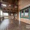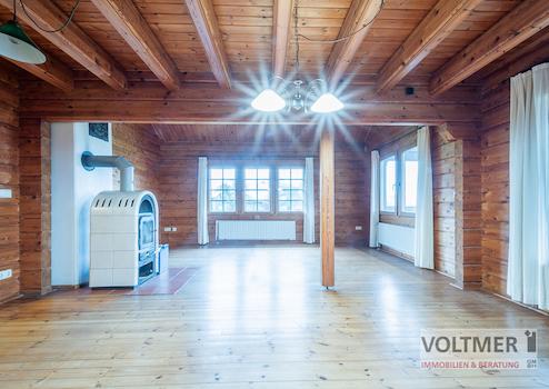 - großes Wohn- Esszimmer mit Kaminofen und Zugang zum überdachten Balkon in Richtung Garten