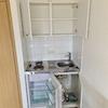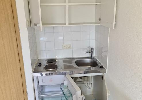 Zur Ausstattung gehören eine Pantryküche mit Kühlschrank, 2-Plattenherd und Spüle sowie ein Oberschrank.