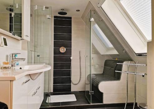 Tatsächlich ist der Badebereich im Haupthaus als Duschbad mit einer gemauerten Sitzgelegenheit ein weiteres Highlight - und ja: diese Sitzgelegenheit ist beheizbar. Großartig.