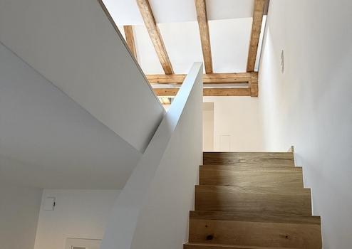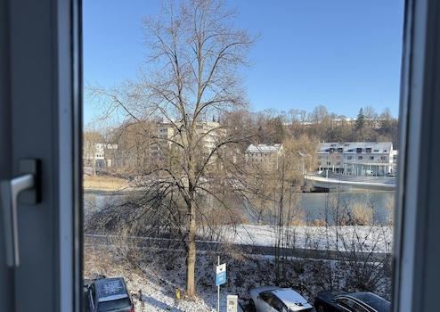 Das Haus bietet einen unverbaubaren Blick auf die Iller, kombiniert mit einer geschützten, ca. 25 m² großen Dachterrasse auf der ruhigen Innenseite. Sichtbare Holzbalken, eine teilweise offene Galerie im Dachgeschoss sowie die freigelegte Stadtmauer machen die Geschichte des Hauses erlebbar – ohne auf modernen Wohnkomfort zu verzichten.
