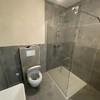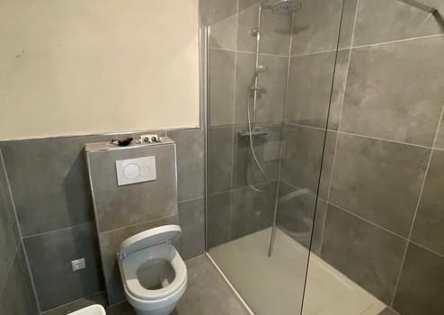 Modernes, neu saniertes Bad mit begehbarer Dusche und großformatigen grauen Fliesen