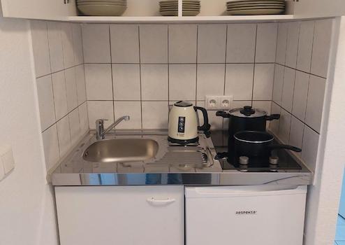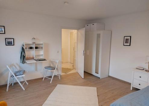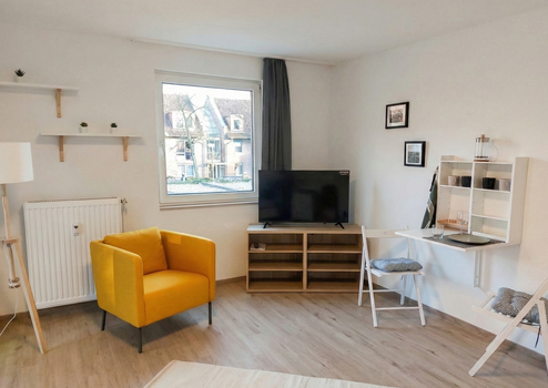 Möblierte, sonnige, ruhige und gut geschnittene Apartmentwohnung mit Balkon, Pantryküche im Flur, ca. 37m² im 1. OG, ca. 5qm Kellerraum. Gute Verkehrsanbindung und gute Parkmöglichkeiten vor dem Gebäude. Das Wohngebäude ist gut gepflegt und in einer ruhigen Wohngegend. Wohnzimmer: Doppelbett (140cm), Schrank (2-Türer), Esstisch mit Stühlen, Couch, Regale, Kommode und LED Smart-TV (43 Zoll, 4K Ultra HD). Bad: Gefliest, Dusche, Spiegelschrank, Regale, Haartrockner. Pantryküche: Spüle, Herd, Kühlschrank mit Eisfach, Wasserkocher, komplett ausgestattet mit Geschirr, Besteck und div. Küchenzubehör. Sonstiges: Staubsauger, Bügeleisen,