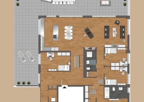 Das Penthouse bietet fünf großzügige Räume mit vielseitigen Nutzungsmöglichkeiten - vom privaten Schlafbereich über Gäste- oder Kinderzimmer bis hin zu einem separaten Arbeitsbereich. Insgesamt stehen drei hochwertig ausgestattete Badezimmer zur Verfügung, eines davon en suite zum Masterbereich. Dies sorgt für ein hohes Maß an Komfort, Privatsphäre und Alltagstauglichkeit, auch für anspruchsvolle Eigennutzer.